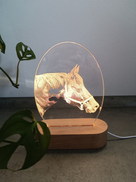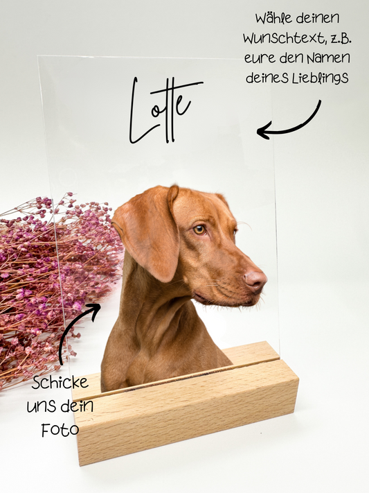 Personalisierte Fotogravur auf Acrylglas | Plexiglas mit LED Sockel