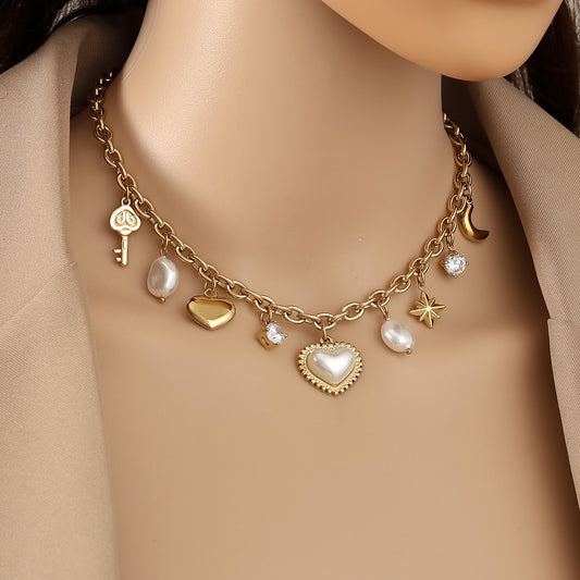 Diamond Pearl Heart And Star Edelstahl Halskette | 40 cm