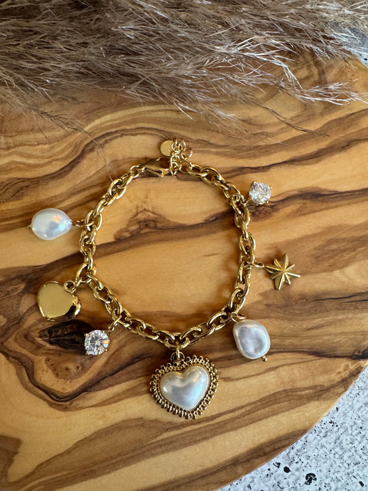 Diamond Pearl Heart And Star Edelstahl Armband | 16 cm